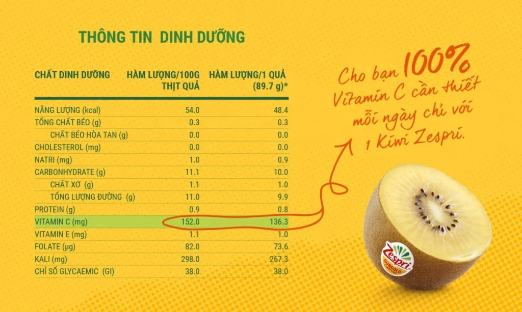 Một quả kiwi Zespri vàng chứa lượng Vitamin C gấp ba lần so với một quả cam, cung cấp hơn 20 loại vitamin và khoáng chất thiết yếu. Vitamin C là một chất chống oxy hóa mạnh, giúp tăng cường hệ miễn dịch, bảo vệ cơ thể khỏi các tác nhân gây hại từ môi trường, và hỗ trợ quá trình hồi phục của cơ thể.