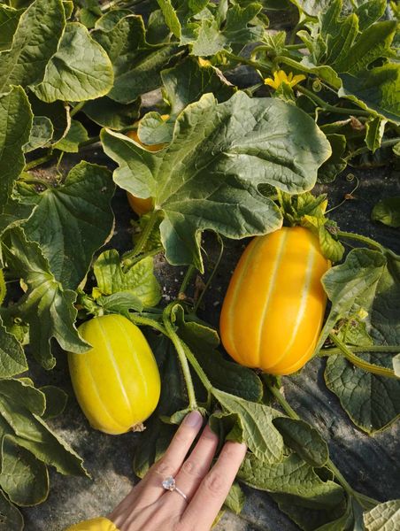 Vỏ màu vàng tươi với các sọc trắng chạy dọc thân, mỏng nhưng dai, giúp bảo vệ trái dưa khỏi tác động bên ngoài.